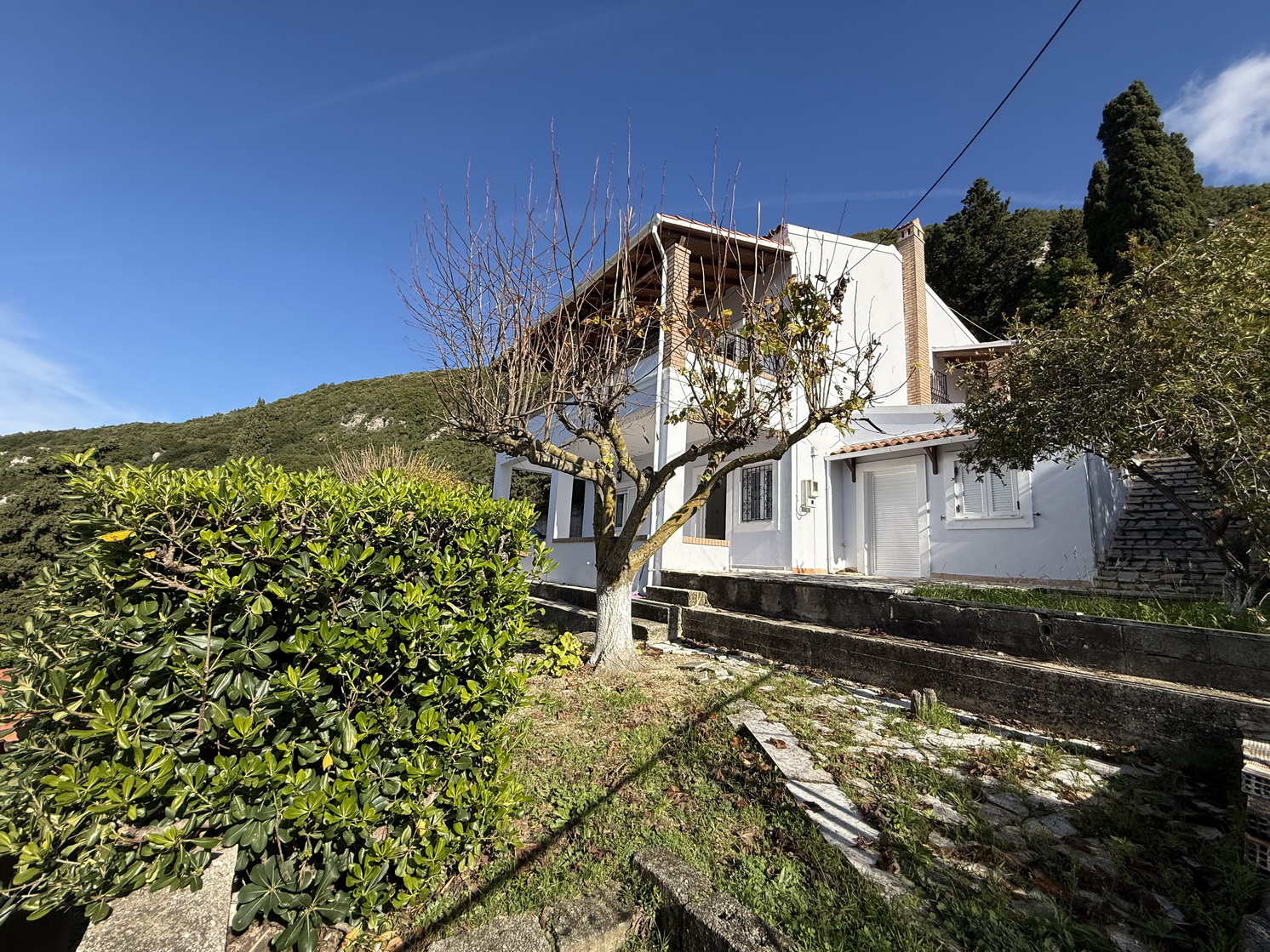 A beautiful detached house situated just outside the village of Pentati in west Corfu, surrounded by lush greenery that offers complete privacy along with wonderful sea views and enchanting sunsets. Set on a verdant 2,650 m² plot, the property has easy access from a municipal road and is located very close to local shops, traditional tavernas, and just 3 km from the nearest beach. Entering through the private gate, you walk through a beautifully landscaped garden filled with cypress trees, olive trees, and flowers, leading to a spacious parking area and the entrance of the home, which is arranged over two separate levels.